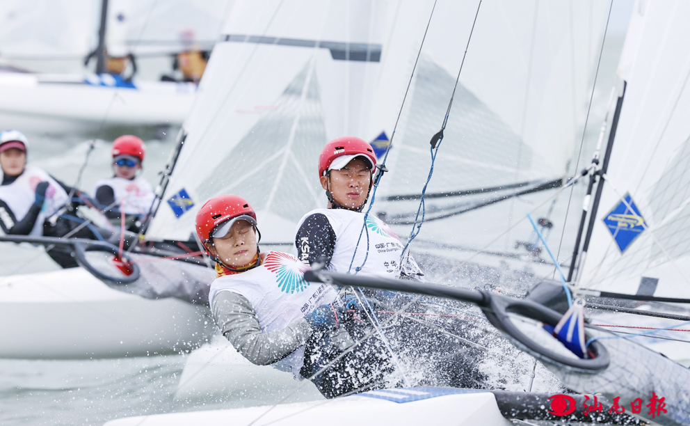 運(yùn)動(dòng)員駕馭帆船劈風(fēng)斬浪,奮勇前行。