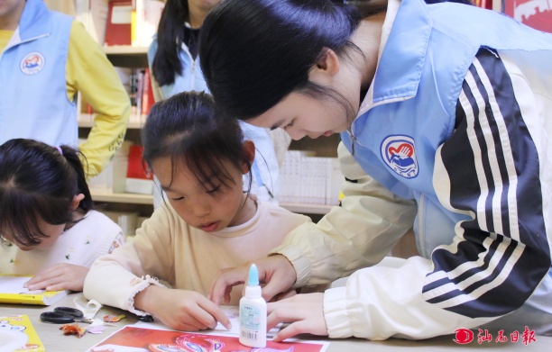 志愿隊隊員在指導(dǎo)小朋友拼接“魚鱗”。