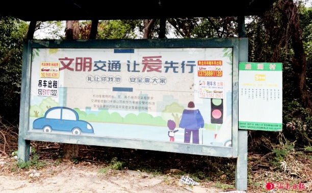公交站牌貼滿小廣告。